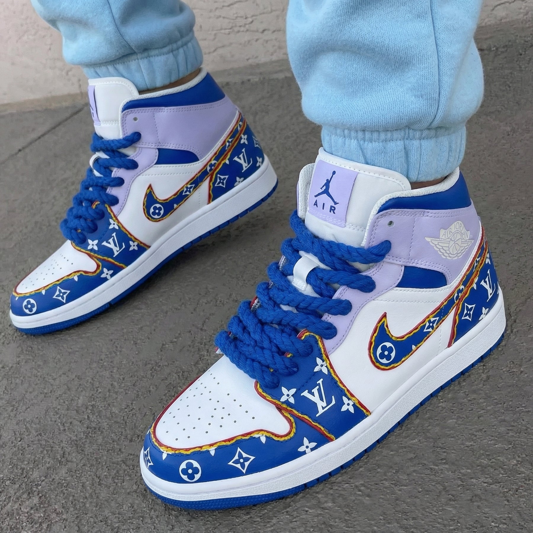 Step up your sneaker game with these one - of - a - kind Custom AJ1s! Featuring a striking purple and blue colorway, these Custom shoes are adorned with the iconic LV pattern that screams luxury and style. The bold blue laces add an extra edge. Each pair is meticulously hand - painted, ensuring that you'll be walking in a piece of wearable art. Whether you're hitting the streets or making a statement at a social event, these Custom Sneakers are the perfect blend of fashion and individuality. Don't miss out on owning a pair of these exclusive kicks!